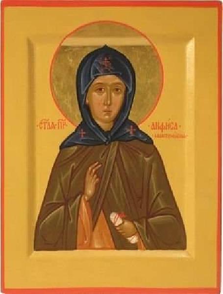 Преподобна Анфіса жила в Мантінеї Пафлагонській у Малій Азії у VIII столітті. Рано залишивши світ, свята Анфіса трудилася в горах у повній самоті. Прийнявши чернечий постриг від ієромонаха Сисінія, вона стала ігуменією в обителі, де зібралося 90 сестер. Преподобна Анфіса постраждала за царювання імператора Костянтина Копроніма, який змушував святу зректися шанування святих ікон. За невиконання наказу імператора преподобна Анфіса була піддана катуванням. На тортурах була присутня дружина імператора, якій свята передбачила народження хлопчика та дівчинки. Коли пророцтво мучениці виповнилося, її відпустили на волю до своєї обителі, де вона померла в глибокій старості. Дівчинка, що народилася у дружини імператора, була названа Анфісою. Проживши Богоугодне життя, вона була прийнята Господом у образ святих.