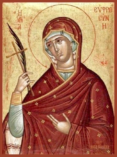 Преподобна Євфросинія народилася на початку V століття в місті Олександрії в сім'ї знатних та багатих батьків і була єдиною дитиною. Мати Єфросинії померла зарано. Виховував дівчинку батько, Пафнутій, який був глибоко віруючим, благочестивим християнином. Він часто відвідував монастир, ігумен якого був його духовним наставником. Коли Євфросинії виповнилося 18 років, батько хотів видати заміж дочку. Він попрямував до монастиря до свого наставника, щоб отримати благословення на майбутній шлюб дочки. Ігумен розмовляв з дівчиною і дав їй своє благословення, але свята Євфросинія прагнула чернечого життя. Прийнявши таємно постриг від ченця-мандрівника, вона покинула батьківський дім і вирішила вступити в обитель, щоб провести життя на самоті і молитві.Побоюючись, однак, що в жіночому монастирі її виявить батько, вона, назвавши себе євнухом Ізмарагдом, прийшла до того самого чоловічого монастиря, який з дитинства відвідувала разом із батьком. Іноки не впізнали переодягнуту в чоловічу сукню Єфросинію і прийняли до своєї обителі. У самотній келії у працях, пості та молитві свята Євфросинія провела 38 років і досягла високої духовної досконалості. Її батько сумував за втратою коханої дочки і не раз, за порадою настоятеля, розмовляв з ченцем Ізмарагдом, відкриваючи йому свій смуток, і знаходив у нього духовну втіху. Перед смертю преподобна Єфросинія відкрила скорботному батькові свою таємницю і просила, щоб ніхто, крім нього, не готував до поховання її тіла. Поховавши дочку, Пафнутий роздав все своє майно жебракам та монастирю та прийняв чернецтво. Десять років, аж до своєї смерті, він трудився в келії своєї дочки.