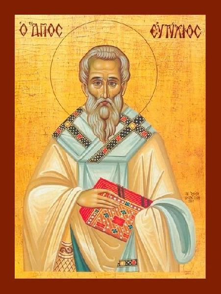 Священномученик Євтихій. Святий апостольського століття - І століття, учень першоверховного апостола Павла та апостола-євангеліста Іоанна Богослова. Святий Євтихій апостолами був зведений в єпископський сан, і хоча не належить ні 12-ти, ні 70-ти учнів Христа, нерідко і сам називається «апостолом від менших». Згідно з Житієм, священномученик Євтихій зазнав від язичників безліч тортур: його мучили голодом, стругали залізом тіло, кидали у вогонь і на поживу диким звірам. Однак чудесним чином дикий лев не торкнувся святого, але віддав хвалу Творцеві, заговоривши людським голосом. На початку II століття святий Євтихій прийняв мученицький вінець, будучи усіченим мечем.