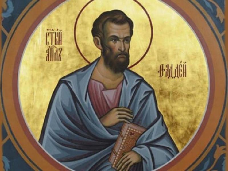 Апостол від сімидесяти Фаддей, єпископ Едеський, Бейрутський. Святий I століття від Різдва Христового. Входив до сімдесяти учнів Спасителя, яких Він обрав за першими 12 апостолами. Учень святого Іоанна Хрестителя, який хрестив Фаддея, тим самим привівши до Христа. Потім цей святий став одним із учнів Самого Спасителя.Після Вознесіння Господнього апостол Фаддей проповідував Слово Боже у низці місцевостей, у тому числі створив та очолив Єдеську єпархію. Пізніше вирушив на проповідь до Бейрута, де також заснував Церкву і мирно відійшов до Господа у 44-річному віці. Хоча є й давній вірменський переказ, що апостол Фаддей мученицько помер 50 року від Різдва Христового.