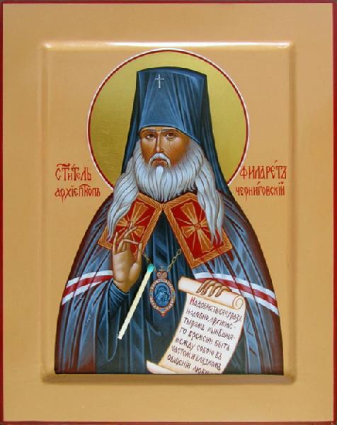 Избранный угодниче Христов, святителю отче наш Филарете, славо и церковное украшение земли Черниговския, богомудрый светильниче и наставниче к тебе притекающих, душу за овцы своя положивый и по преставлении твоем нас в бедах не оставляющий, да со умилением зовем ти: