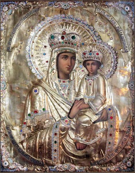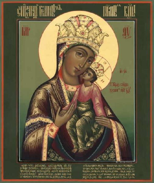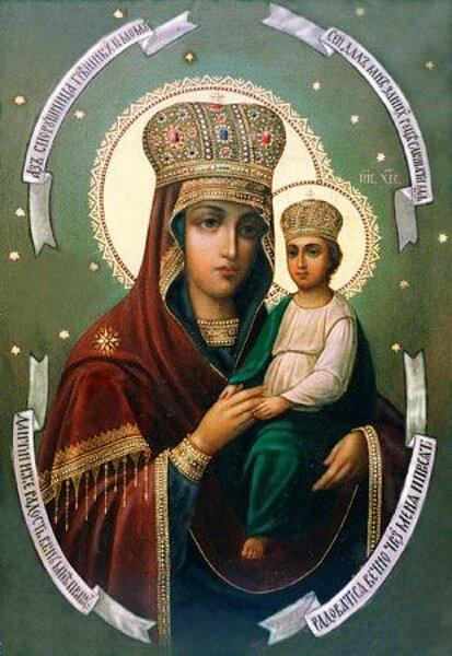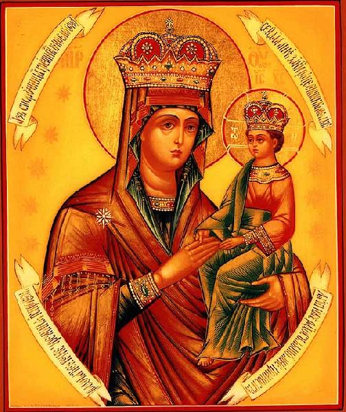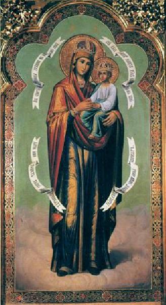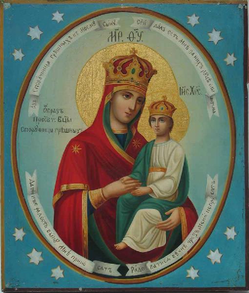 Ікона Божої Матері «Споручниця грішних» названа так відповідно до напису, що зберігся на іконі: «Аз Споручница грешных к Моему Сыну…»