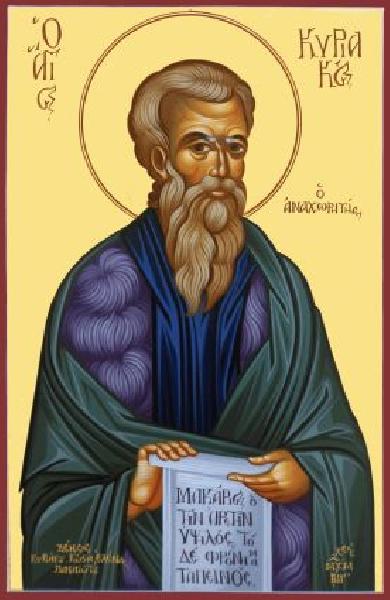 Преподобний Киріак († 556) народився в Коринфі, в сім’ї пресвітера соборної церкви Іоана і дружини його Євдоксії. Родич пресвітера Іоана єпископ Коринфський Петро, бачачи, що Киріак зростає тихим і розсудливим отроком, поставив його читцем у церкві. Постійно вправляючись у читанні Святого Письма, юний Киріак всією душею поринув до Господа і з молодих років намагався проводити богоугодне життя. У віці 18 років, будучи присутнім на церковній службі, Киріак був глибоко зворушений, почувши слова Євангелія: «Якщо хто хоче йти за Мною, нехай зречеться себе, і візьме хрест свій та йде за Мною» (Мф. 16:24). Зрозумівши свій шлях, Киріак звершив молитву, вийшов з церкви і, не заходячи додому, таємно відправився на пристань. Там він сів на корабель і вирушив до Єрусалима.