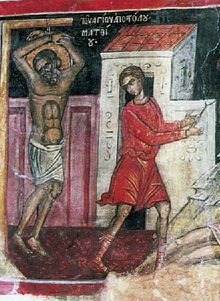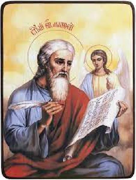 Святой апостол Матфей родился в Вифлееме, происходил из колена Иудина; с раннего детства он изучал Закон Божий по Священным Книгам под руководством святого Симеона Богоприимца. Когда Господь Исус Христос явил Себя миру, святой Матфей уверовал в Него как в Мессию, неотступно следовал за Ним и был избран в число 70 учеников, которых Господь "посылал по два пред лицем Своим" (Лк. 10, 1). По Вознесении Спасителя апостол Матфей был избран по жребию в число 12 апостолов вместо отпадшего Иуды Искариотского (Деян. 1, 15-26). После Сошествия Святого Духа апостол Матфей проповедовал Евангелие в Иерусалиме и в Иудее вместе с прочими апостолами (Деян. 6, 2; 8, 14). Из Иерусалима с апостолами Петром и Андреем ходил в Антиохию Сирийскую, был в каппадокийском городе Тиане и в Синопе. Здесь апостола Матфея заключили в темницу, из которой он был чудесно освобожден апостолом Андреем Первозванным. После этого апостол Матфей путешествовал в Амасию, город на берегу Понта. Во время 3-го путешествия апостола Андрея святой Матфей был с ним в Едессе и Севастии. По церковному преданию, он был с проповедью в Эфиопии Понтийской (нынешняя Западная Грузия), Македонии, многократно подвергаясь смертельной опасности, но Господь сохранял его живым для дальнейшей проповеди Евангелия. Однажды язычники заставили апостола выпить отравленное питье. Апостол выпил его и не только сам остался невредимым, но исцелил и других узников, ослепших от этого питья. Когда святой Матфей вышел из темницы, язычники тщетно искали его, так как он сделался для них невидимым. В другой раз, когда язычники в ярости бросились, чтобы убить апостола, земля разверзлась и поглотила их. Апостол Матфей вернулся в Иудею и не переставал просвещать своих соотечественников светом учения Христова. Он творил великие чудеса Именем Господа Исуса и обратил очень многих к вере во Христа. Иудейский первосвященник Анан, ненавидевший Христа, давший ранее повеление сбросить с высоты храма апостола Иакова, брата Господня, приказал взять апостола Матфея и представить на суд синедриона в Иерусалиме. Нечестивый Анан произнес речь, в которой кощунственно хулил Господа. В ответ апостол Матфей показал на пророчествах Ветхого Завета, что Исус Христос - Истинный Бог, Мессия, обещанный Богом Израилю, Сын Божий, Единосущный и Совечный Богу Отцу. После этих слов апостол Матфей был осужден синедрионом на смерть и побит камнями. Когда святой Матфей был уже мертв, иудеи, скрывая преступление, отсекли ему голову, как противнику кесаря. (По некоторым источникам, апостола Матфея распяли на кресте. Некоторые указывают, что он скончался в Колхиде). Смерть за Христа и венец мученика апостол Матфей воспринял около 63 года.