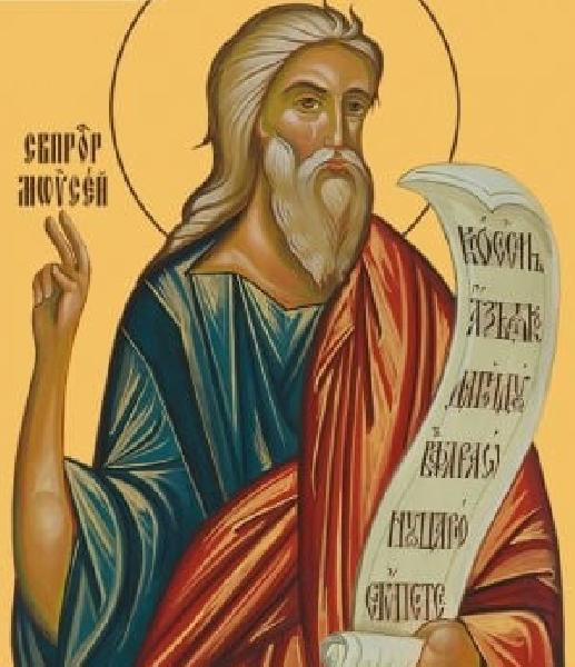 Святий пророк Боговидець Мойсей. Один із найбільших старозавітних святих, пророк і законодавець ізраїльського народу, про якого свідчать кілька біблійних книг: Вихід, Числа і Второзаконня. Народився пророк Мойсей в Єгипті близько 1570 до Різдва Христового і був вихований дочкою фараона. Бог відкрив пророку Мойсеєві багато таємниць буття, у тому числі створення світу і людини. Саме цьому святому Бог на Синайській горі дарував 10 заповідей. Пророк Мойсей відійшов до Господа у 120-річному віці (на згадку про це досі юдеї традиційно бажають один одному дожити саме до 120 років).