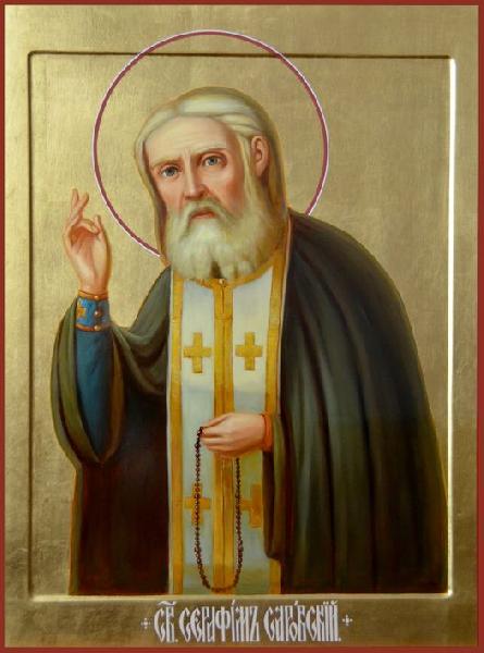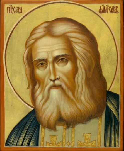 О, пречу́дный о́тче Серафи́ме, вели́кий Саро́вский чудотво́рче, всем прибега́ющим к тебе́ скоропослу́шный помо́щниче! Во дни земна́го жития́ твоего́ никто́же от тебе́ тощ и неуте́шен отъи́де, но всем в сла́дость бысть виде́ние ли́ка твоего́ и благоуве́тливый глас слове́с твои́х. К сим же и дар исцеле́ний, дар прозре́ния, дар немощны́х душ врачева́ния оби́лен в тебе́ яви́ся. Егда́ же призва́ тя Бог от земны́х трудо́в к Небе́сному упокое́нию, николи́же любо́вь твоя́ преста́ от нас, и невозмо́жно есть исчи́слити чудеса́ твоя́, умно́жившаяся, я́ко зве́зды небе́сныя: се бо по всем конце́м земли́ на́шея лю́дем Бо́жиим явля́ешися и да́руеши им исцеле́ния. Те́мже и мы вопие́м ти: о прети́хий и кро́ткий уго́дниче Бо́жий, дерзнове́нный к Нему́ моли́твенниче, николи́же призыва́ющия тя отрева́яй, вознеси́ о нас благомо́щную твою́ моли́тву ко Го́споду Сил, да да́рует нам вся благопотре́бная в жи́зни сей и вся к душе́вному спасе́нию поле́зная, да огради́т нас от паде́ний грехо́вных и и́стинному покая́нию да научи́т нас, во е́же безпреткнове́нно вни́ти нам в ве́чное Небе́сное Ца́рство, иде́же ты ны́не в незаходи́мей сия́еши сла́ве, и та́мо воспева́ти со все́ми святы́ми Живонача́льную Тро́ицу до сконча́ния ве́ка. Ами́нь.