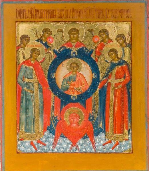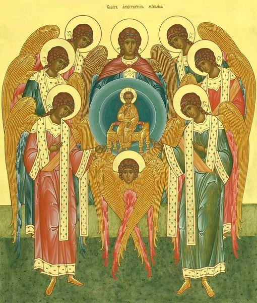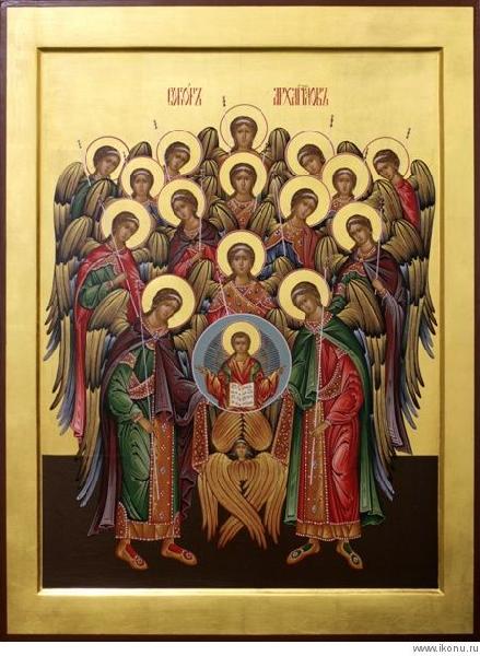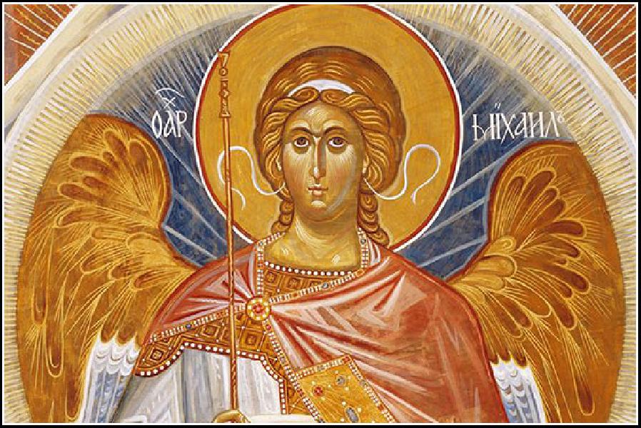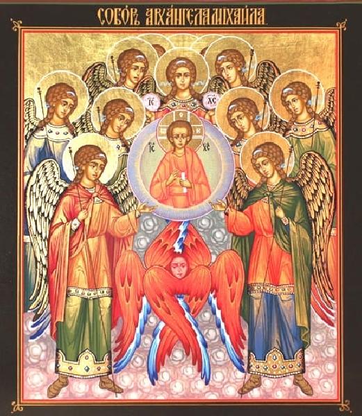Над всеми девятью чинами поставлен Господом святой Архистратиг Михаил (имя его в переводе с еврейского – «кто как Бог») – верный служитель Божий, ибо он низринул с Неба возгордившегося денницу с другими павшими духами. А к остальным Ангельским Силам он воскликнул: «Вонмем! Станем добре пред Создателем нашим и не помыслим неугодного Богу!» По Церковному преданию, запечатленному в службе Архистратигу Михаилу, он принимал участие во многих ветхозаветных событиях. Во время выхода израильтян из Египта он предводительствовал им в виде столпа облачного днем и столпа огненного ночью. Через него явилась Сила Господня, уничтожившая египтян и фараона, преследовавших израильтян. Архистратиг Михаил защищал Израиль во всех бедствиях. Он явился Иисусу Навину и открыл волю Господа на взятие Иерихона (Нав. 5, 13–16). Сила великого Архистратига Божия явилась в уничтожении 185 тысяч воинов Ассирийского царя Сеннахирима (4 Цар. 19, 35), в поражении нечестивого вождя Антиохова Илиодора и в ограждении от огня трех святых отроков – Анании, Азарии и Мисаила, брошенных в печь на сожжение за отказ поклониться идолу (Дан. 3, 92–95). По воле Божией, Архистратиг перенес пророка Аввакума из Иудеи в Вавилон, чтобы дать пищу Даниилу, в рове со львами заключенному (кондак акафиста, 8). Архангел Михаил запретил диаволу явить иудеям тело святого пророка Моисея для обожения (Иуд. 1, 9).