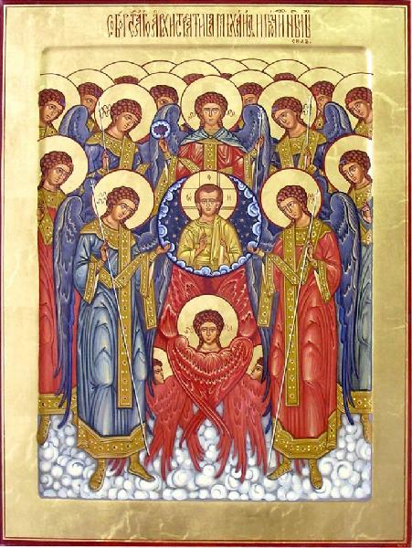 Серафимы (Пламенеющие, Огненные) шестокрылатые (Ис. 6, 2). Предстоят ближе всех Пресвятой Троице. Они пламенеют любовью к Богу и других побуждают к ней.