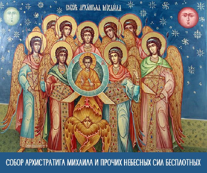 Празднование Собора Архистратига Божия Михаила и прочих Небесных Сил бесплотных установлено в начале IV века на Поместном Лаодикийском Соборе, бывшем за несколько лет до I Вселенского Собора. Лаодикийский Собор 35-м правилом осудил и отверг еретическое поклонение ангелам как творцам и правителям мира и утвердил православное их почитание. Совершается праздник в ноябре – девятом месяце от марта (с которого в древности начинался год) – в соответствии с числом 9-ти чинов Ангельских. Восьмой же день месяца указывает на будущий Собор всех Сил Небесных в день Страшного Суда Божия, который святые отцы называют «днем восьмым», ибо после века сего, идущего седмицами дней, наступит «день осмый», и тогда «приидет Сын Человеческий в Славе Своей и вси святии Ангелы с Ним» (Мф. 25, 31).
