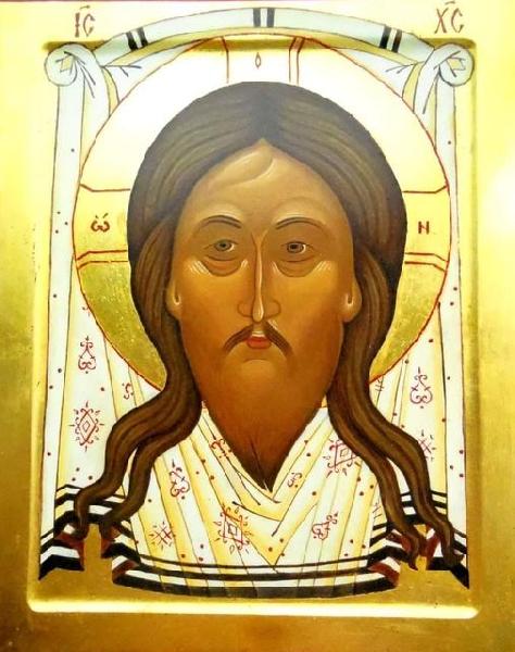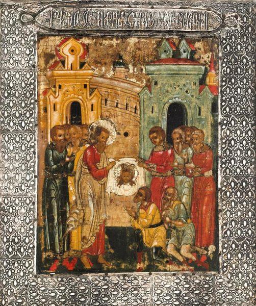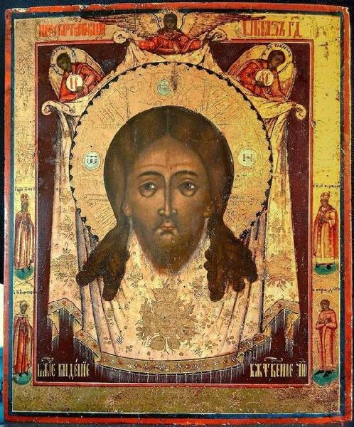 Уверяя человеком Господь, вочеловечения Своего тайну ужасную, самописует богомужныи Свой образ на убрусе, и первообразное убо вознес от горы Елеонския, на престоле спосажает Отчи, поклонятися от безтелесных ангел: подобие же первообразнаго нам дарова поклонятися, его же объемлюще душею же и сердцем, почитаем того лобызающе.