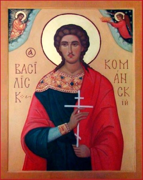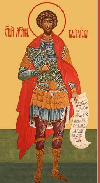 Святой мученик Василиск был племянником святого мученика Феодора Тирона (память 17 февраля) и пострадал с его братьями Евтропием и Клеоником во время гонения на христиан императора Максимиана Галерия (305–311). Святые мученики Клеоник и Евтропий были распяты на крестах (память их 3 марта), а мученик Василиск был отправлен в Команы, где содержался в темнице. Правитель Агриппа, прибыв в город Амасию, начал преследовать христиан. Святой Василиск в темнице готовился к предстоявшему мученическому подвигу. Во сне ему явился Господь, обещавший мученику Свою помощь, и предсказал ему мученическую кончину в Команах. Святой Василиск просил темничных стражей отпустить его в родное селение проститься с родными. Его отпустили, так как почитали за святость жизни и совершаемые чудеса. Придя домой, святой Василиск сообщил родным, что видится с ними в последний раз, и убеждал их твердо стоять за веру.